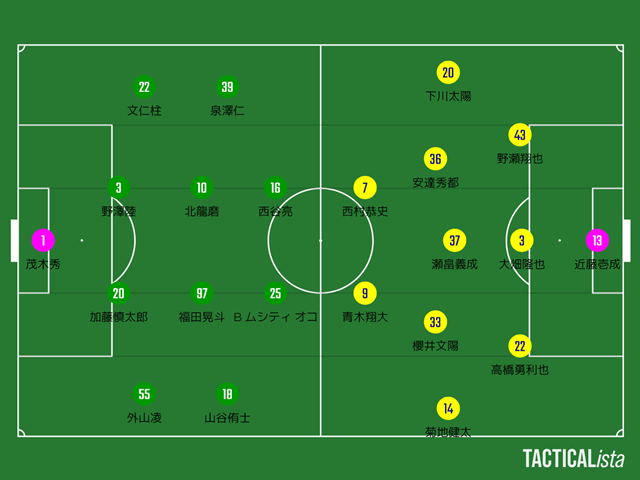 生地慶充、箱崎達也、川本梨誉に代わって、文仁柱、福田晃斗、ブヴィク ムシティ オコがスタメン起用となった。
