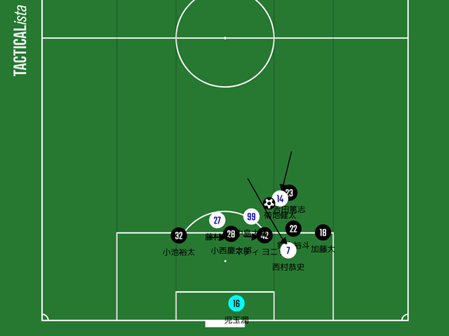 神垣から西村恭史に送られると、西村はゴールに向かうプレー、続いて右サイドへの展開を考えていたと思われる。