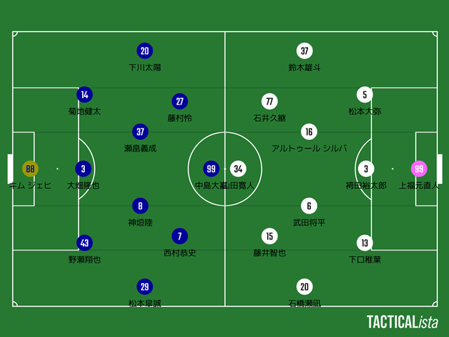 まぁ中島大嘉、下川太陽の位置を考えると最終ラインは適正であり、最終ラインが上がらなかったのではなく、下口が1人だけ前に出ていた…というのが正解か?